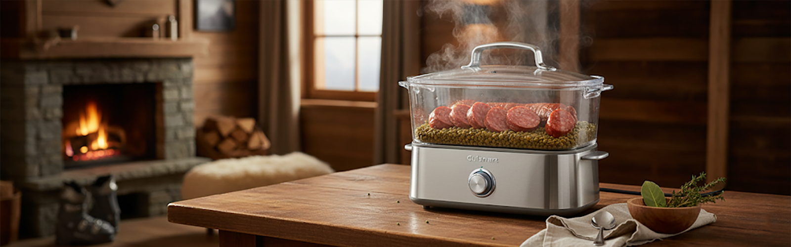 - Ajouter ensuite la saucisse de Morteau dans le panier vapeur et le placer au dessus de la cuve du cuiseur à céréales ou bien directement dans le faitout.